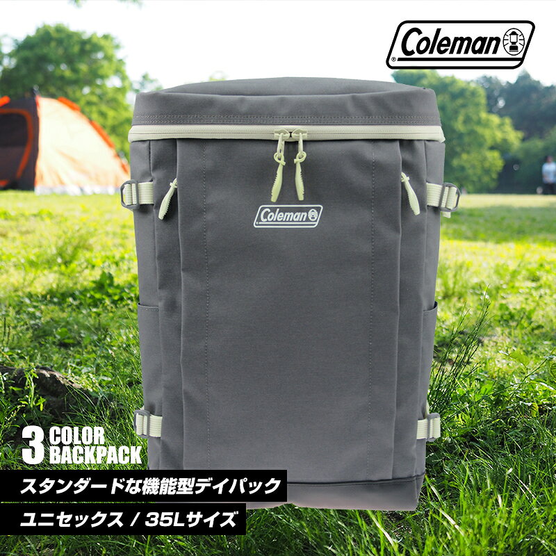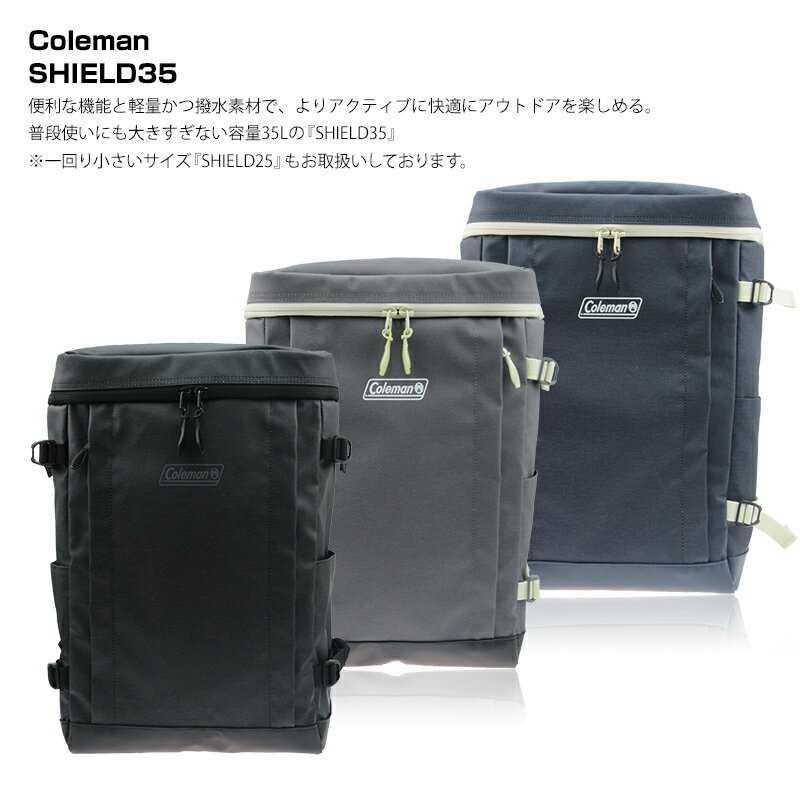 Coleman コールマン SHIELD35 防水 リュック バックパック メーカー Coleman サイズ 本体:31cm×50cm×18cm カラー ヘザーブラック / シャークグレー / インディゴネイビー 素材 ナイロン / ポリエステル 仕様 ・留め具:ダブルファスナー ・ポケット: メインルーム内…ポケット大1/ポケット中1/ペンホルダー2 A4サイズ対応仕切り(クッション性有り)1 トップ…B6サイズ対応ファスナーポケット1/カラビナストラップ有り フロントルーム…A4サイズ対応ファスナーポケット1 (左右にファスナーが付いており、貫通する形状です。